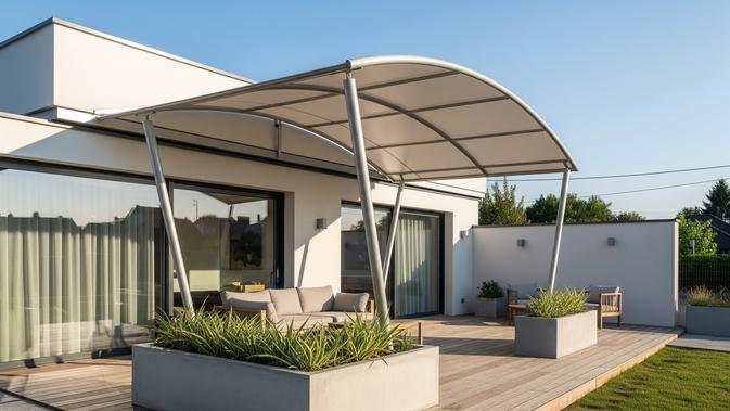Model kanopi melengkung dapat memberikan sentuhan elegan pada rumah modern. Keunikannya terletak pada kurva lembut yang menambah karakter visual tanpa mengurangi fungsionalitasnya. Desain ini memiliki kemampuan untuk menyesuaikan dengan berbagai gaya arsitektur rumah, memberikan tampilan yang harmonis dan menyatu dengan bangunan utama.
